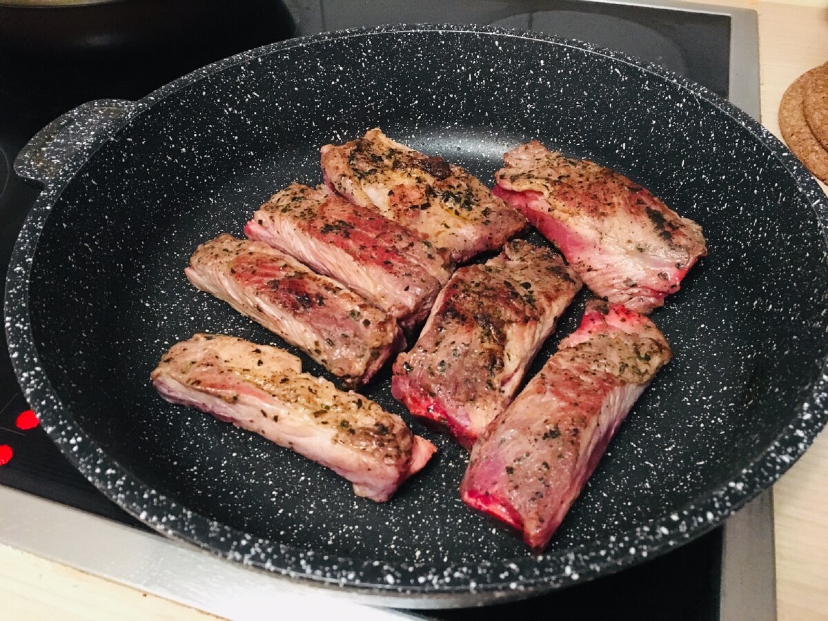 🍖Нарезаем рёбра и выкладываем их на раскалённую сковороду, обжариваем их до золотистой корочки и обязательно до ПОЛНОЙ ГОТОВНОСТИ, свинину не рекомендуется есть полусырой☝🏻