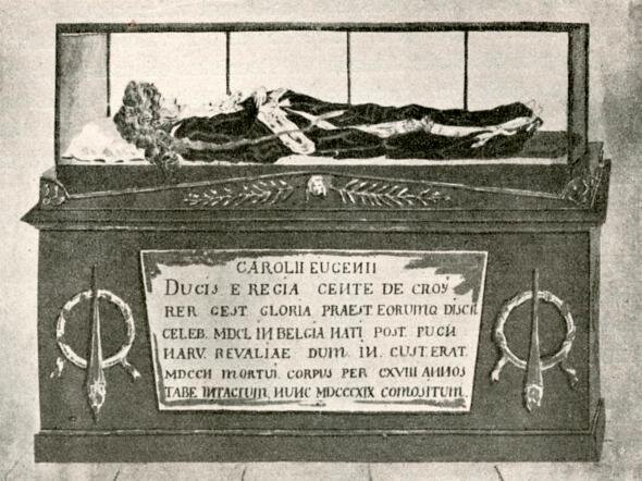 В XIX веке главной достопримечательностью церкви Святого Николая в российском Ревеле (Таллине) считалось нетленное тело человека в старинном парике. Это была мумия Карла-Евгения де Круа — фельдмаршала, командовавшего войском Петра I в сражении под Нарвой. Сподвижник Петра Великого Уроженец городка Ле-Ре герцог де Круа, подобно другим офицерам-наемникам XVII века, готов был сражаться под любыми знаменами. Нидерландский аристократ за свою жизнь успел повоевать в армиях Дании, Австрии и Саксонии, участвовал в боях против шведов и турок. В 1700 году, приехав в качестве посланца от саксонского курфюрста и короля Польши Августа Сильного к Петру I, герцог получил неожиданное назначение. Де Круа так понравился царю, что тот уговорил его стать главнокомандующим русской армией, пожаловав чин генерал-фельдмаршала. Буквально через пару месяцев события битвы под Нарвой показали, что де Круа был прав, не соглашаясь поначалу с предложением Петра. Герцог принял ошибочное тактическое решение. Остави