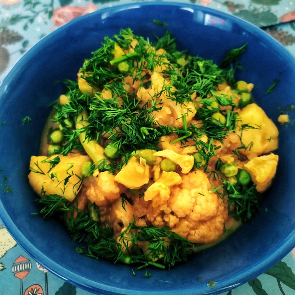 Чем плоха советская кухня? Да ничем) Она подарила нам простые в исполнении, вкусные и сытные блюда! Например, вот это овощное рагу просто прекрасно. А уж приготовить его точно не составит никакого труда. Рецепт по сборнику рецептур блюд и кулинарных изделий 1982 года – рекомендую! Нарезанные кубиками картофель и морковь слегка обжаривают, лук пассеруют. Цветную капусту разбирают на отдельные кочешки и варят. Затем картофель и овощи соединяют с томатной пастой или томатным пюре, добавляют кипятка и тушат 15 минут. После этого добавляют нарезанные кабачки, вареную цветную капусту и продолжают тушить 15-20 мин. За 5-10 мин до готовности кладут консервированный зеленый горошек, растертый чеснок и специи. Можно посыпать нарезанной петрушкой и укропом)