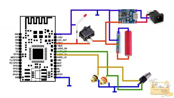 Как сделать простое беспроводное устройство для передачи музыки по Bluetooth. Пользуюсь я домашней аудиосистемой 2.1. Состоит она с сабвуфера и двух сателлитов. Проигрываю я через систему обычно фильмы. Иногда хочется послушать музыку. Есть провод переходник, но его длина не велика. Задумал я сделать беспроводную систему. Через нее можно без проводов проигрывать музыку со смартфона. Материалы для изготовления Схема Пару слов о схеме. Есть модуль, Bluetooth. Питаем его от аккумулятора, через выключатель. Заряжается аккумулятор через контроллер заряда. Выход с модуля идет на разъемы «тюльпан» и jack 3.5 мм. Видео инструкция [media=https://www.youtube.com/watch?v=REbywnVctdM&] О компонентах Нужен листовой пластик. У меня листовой ПВХ. С ним очень просто работать, режется острым ножом. Bluetooth модуль из Китая. Очень маленький. Выключатель панельный плоский. Снял с поломанного ночника. Разъемы RCA или просто «тюльпан». Вырезал два штуки со старого DVD плеера. Разъем питания.