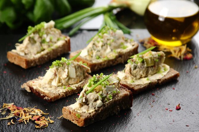 Здравствуйте, друзья. Сегодня для вас очень интересный и вкусный рецепт не привычных бутербродов. Такие бутерброды будет не стыдно поставить на праздничный стол, более того они могут стать его украшением. Плюс ко всему Бутерброды с рыбной пастой, яйцом и маринованным огурцом щей очень вкусные. Ингредиенты: 🍔 цельнозерновой хлеб, ломтики - 6 шт. 🍔 майонез - 3 ст л 🍔 копченая скумбрия - 100 гр 🍔 яйца вкрутую - 2 шт. 🍔 маринованный огурец - 2 шт. 🍔 зеленый лук - 0,5 пучка 🍔 черный перец - 1 щепотка Шаг 1 Обмазываем ломтики хлеба маргарином. Яйца и огурцы порежьте небольшими кубиками, а рыбу очистите, выньте кости и разомните вилкой. В миске смешайте майонез с измельченной скумбрией и перцем тщательно - лучше всего это сделать вилкой. Шаг 2 Добавьте в миску измельченные яйца и огурцы. Все перемешайте вместе. Шаг 3 Нанесите готовую пасту на смазанные ломтики хлеба. Лук мелко нарежьте и сверху посыпьте бутерброды. Вот и все очень вкусные бутерброды готовы. Как всегда всем желаю приятн