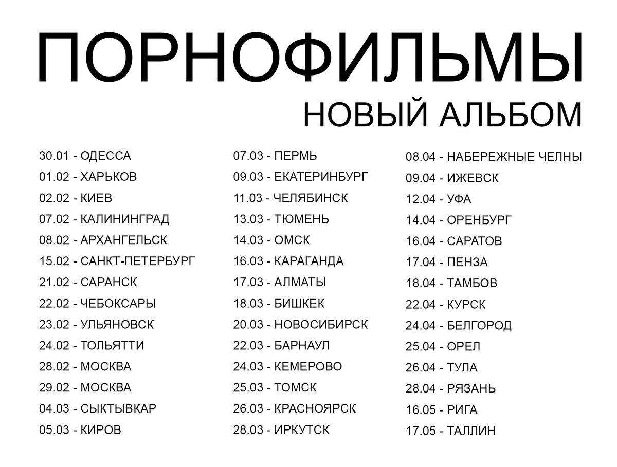 Это пройдёт! Добрый день, вечер или ночь. Смотря когда вы читаете эти мысли. Российская панк-рок группа «Порнофильмы» выпустила свой новый альбом и отправились в тур в поддержку данного альбома. Афиша их концертов: Новый альбом называется: «Это пройдет», так же как и заглавная песня с данного альбома. Ссылка на альбом: Приятного прослушивания! Пишите в комментариях как Вам новый альбом? И подписывайтесь на канал, чтобы следить за новостями «Приезжего»