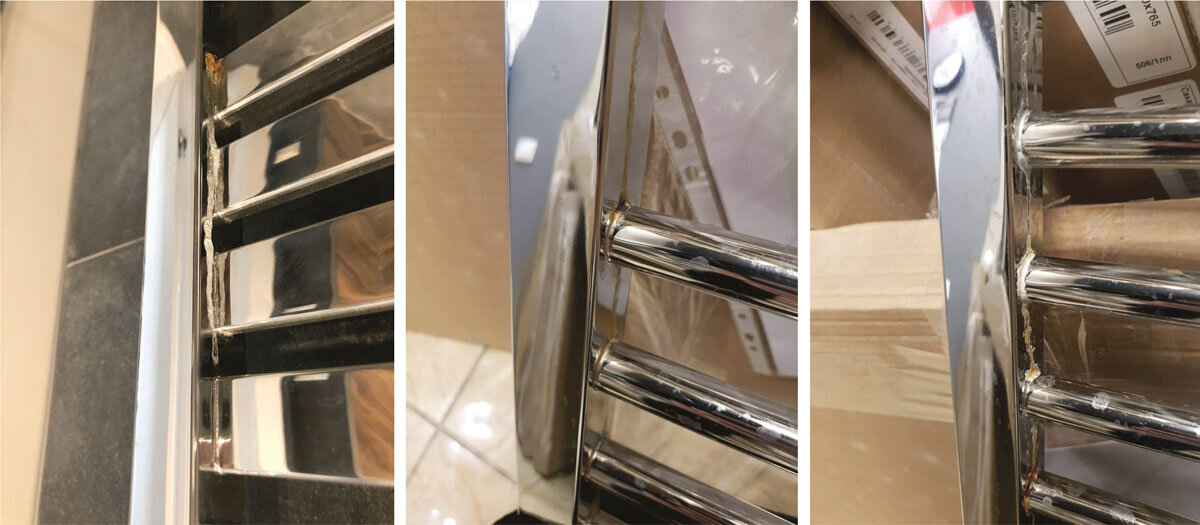 В этой статье мы расскажем о главном враге водяных полотенцесушителей и как технически правильно его победить. Даже высококачественная, нержавеющая сталь марки AISI 304L которую мы используем в полотенцесушителях, подвержена данной проблеме, если установка устройства выполнена ненадлежащим образом. Электрокоррозия – это коррозия материалов под влиянием электрического тока от внешнего источника (коррозия "блуждающих токов"). Признаки электрокоррозии – это единичные или множественные потемнения корпуса полотенцесушителя с образованием пор (мелких сквозных отверстий) на сварочных швах и ровных участках поверхности трубы. Причина возникновения электрокоррозии – это наличие блуждающих токов в системе водоснабжения. Такие токи возникают из-за разности потенциалов. Т.е. потенциал электрического поля в стояке, равен потенциалу земли (заземлено), а тот, что в полотенцесушителе – имеет другой потенциал. Между разными потенциалами и возникают "блуждающие токи" при условии появления между ними