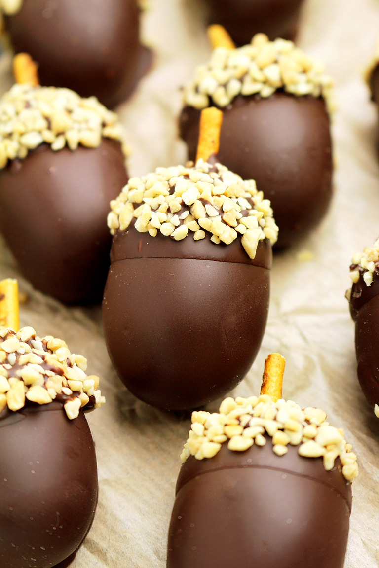 Однажды, нам пришло в голову, а что, если приготовить не только съедобные шишки, но и что-то еще :) Например, желуди! Мы отправились за вдохновением на просторы интернета и теперь делимся с вами этим простым и вкусным рецептом :) ИНГРЕДИЕНТЫ ПРИГОТОВЛЕНИЕ 1. Возьмите противень или разделочную доску и застелите пергаментом. 2. Разломайте соленую соломку на небольшие кусочки, длиной примерно 1-1,5 см. 3. В большой глубокой миске смешайте арахисовую пасту, сливочное масло и ванилин. Добавьте сахарную пудру и хорошо перемешайте, используя вилку. 4. Когда смесь станет твердой и будет становиться трудно замешивать, продолжайте перемешивать руками, пока она не станет гладкой и однородной. 5. Добавьте молоко и снова замешайте руками. Сделайте шарики в форме желудя. Одной столовой ложки достаточно для одного желудя. 6. Положите их на пергаментную бумагу. Остудите в морозилке в течение от 30 минут до 1 часа. Тем временем, растопите шоколадную крошку, добавьте масло и перемешайте. 7. Достаньте же