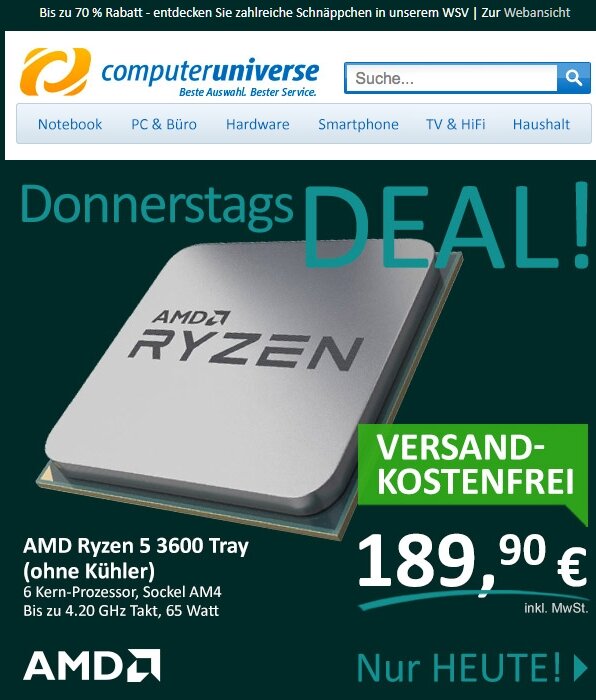 Всем привет,уважаемые читатели! В этой статье я хотел бы рассказать Вам,на что нужно обратить внимание при получении рассылок от немецкого интернет магазина Computeruniverse,и почему это важно. Представьте такую ситуацию,получаете Вы письмо на почту,открываете его и видите такую картину: Смотрите на цену и думаете,ну и что тут такого,цена 189,90 евро.Переходите на сайт и видите там точно такую же цену на этот процессор. В чем же прикол? В том,что нужно выбрать страну Российская Федерация После этого,посмотрите сколько стал стоить процессор о котором шла речь в самом начале статьи,то есть AMD Ryzen 5 3600: Видите разницу? В начале цена была 189,90 евро,а после выбора страны Российская Федерация,цена стала 167,23 евро. К чему эта статья? К тому,что не спешите с электронной почтой,если вы подписаны на рассылку немецкого магазина.Переходите на сайт,меняйте страну на Российская Федерация и только потом прикидывайте разницу в ценах. Буду признателен за вашу подписку и лайк!