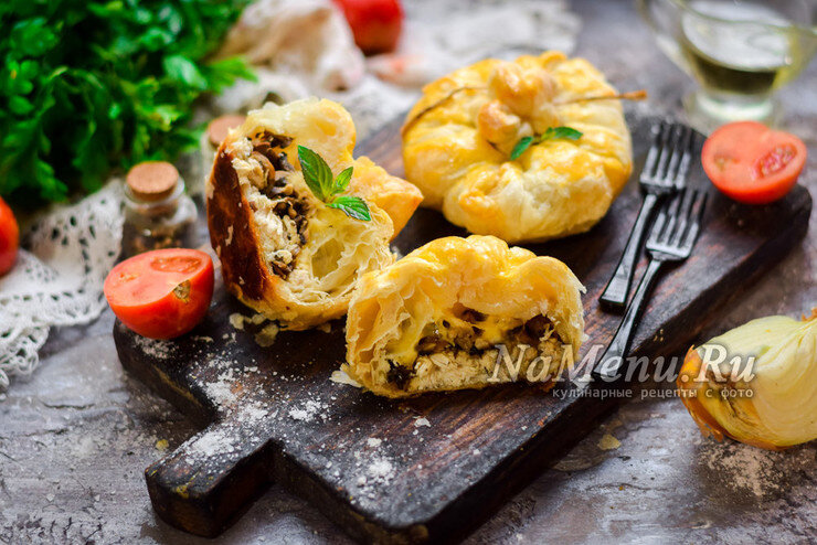 Ингредиенты: 💦Филе курицу сполоснуть, нарезать небольшими кусочками. Шампиньоны вымыть, нарезать средними кусочками 🍄В сковороде прогреть немного растительного масла, выложить курицу и грибы – жарить 10 минут. Посолить, приправить перцем 🥠Слоеное тесто раскатать на рабочей поверхности. Разрезать на порционные прямоугольники, в центр уложить курицу и грибы 🧀Сыр нарезать пластинами, переложить поверх курицы и грибов ✔️Края теста собрать кверху, чтобы получились «мешочки», завязать нитью 🔥Прогреть духовку, установить температуру 180 градусов 🕰Перенести заготовки на промасленный противень, запекать 25 минут. Спустя 10 минут запекания тесто можно смазать взбитым куриным желтком https://namenu.ru/11555/Meshochki_iz_sloenogo_testa_s_kuricej_i_gribami/