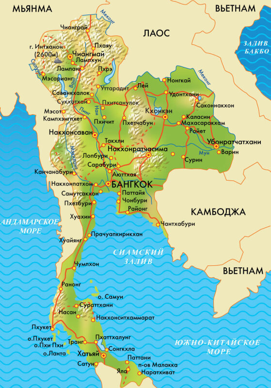 Географически это гористая местность с густыми непроходимыми джунглями и разбросанными тут и там деревеньками. Центральная часть страны, напротив, является равнинной. Именно здесь и расположилась столица страны – город Бангкок. Помимо него, тут имеется также несколько примечательных и популярных курортов. Наконец, юг Таиланда – это бесконечное лазурное море, километровые белые песчаные пляжи, приятные для ног, возможности для дайвинга, рыбной ловли, посещения островов и знакомств с экзотическими животными.