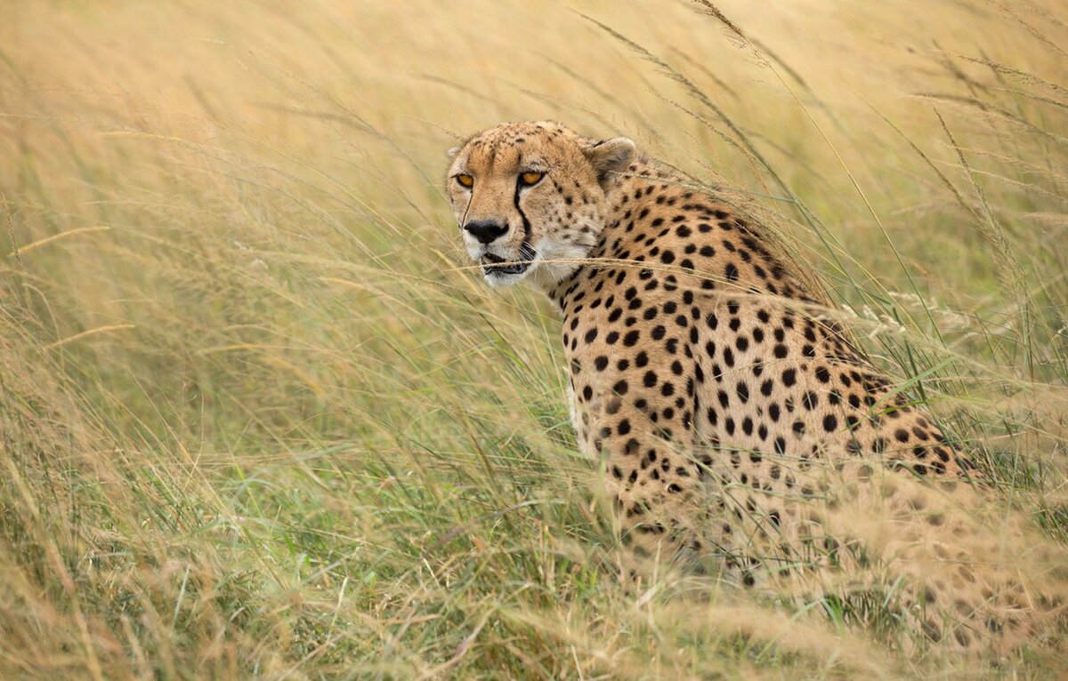1.Гепард. Гепа́рд — хищное млекопитающее семейства кошачьих, обитает в большинстве стран Африки, а также на Ближнем Востоке. Это единственный современный сохранившийся представитель рода Acinonyx. Быстрейший из всех наземных млекопитающих: за 3 секунды может развивать скорость до 110 км/ч. Согласно другим данным максимальная скорость гепардов достигает 93 км/ч. Заметно отличается от других кошачьих. Тело стройное, с развитой мускулатурой и практически без жировых отложений, кажется даже хрупким. У гепарда небольшая голова, высоко расположенные глаза и маленькие закруглённые уши — то есть аэродинамическое построение тела, что служит для лучшей обтекаемости во время скоростного бега. Также гепард имеет грудную клетку и лёгкие большого объёма, что также содействует интенсивному дыханию во время скоростного бега. Окраска песочно-жёлтая, с разбросанными по всему телу мелкими чёрными пятнами, по бокам морды — тонкие чёрные полосы. Масса взрослого гепарда — от 40 до 65 кг, длина тела — от