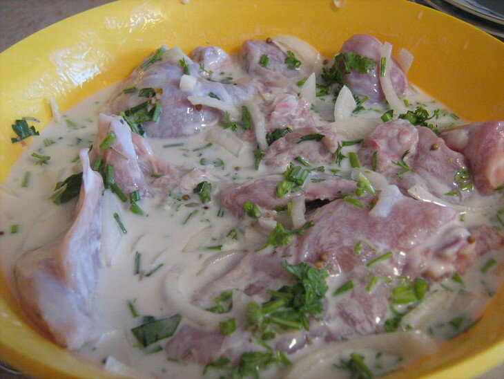 1. Лук почистить, нарезать на небольшие полукольца, немного помять руками, чтобы лук дал сок. Зелень и чеснок мелко порубить. Имбирь истолочь в ступке. Курицу нарезать кусочки среднего размера. Мясо, лук, зелень, чеснок выложить в миску. Добавить кориандр, посолить и поперчить. Залить кефиром. Оставить на 1,5-2 часа. После маринования выложить в горшочки.