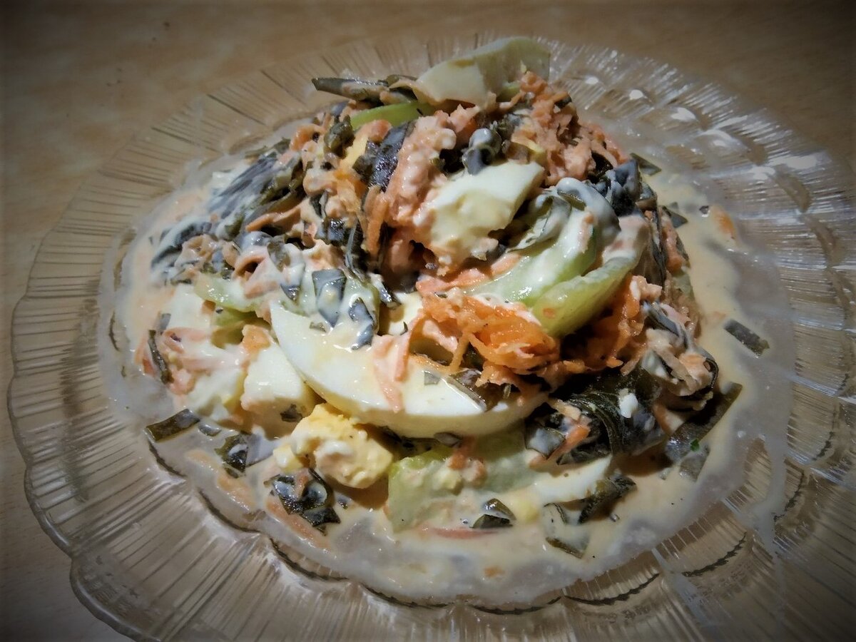 Доброго времени суток,дорогой читатель!Сегодня у нас в меню очень полезный и очень вкусный салат,с острой морковкой,запахом свежего огурца и насыщенной микроэлементами морской капустой. 1 Подготавливаем продукты.Яйца отвариваем вкрутую и чистим. 2 Трем морковь на терке и маринуем.Для этого добавляем смешанный с водой уксус 50 на 50,щепотку молотого кориандра и молотого душистого перца.Соль и сахар кладем по вкусу,как и молотый красный перец. 3 Пока морковь маринуется(примерно 30 минут) чистим от шкурки огурец и нарезаем соломкой. 4 Яйца режем крупными дольками. Смешиваем ингредиенты с морской капустой и наш салат готов! Заправить можно майонезом или соевым соусом. Приятного аппетита!