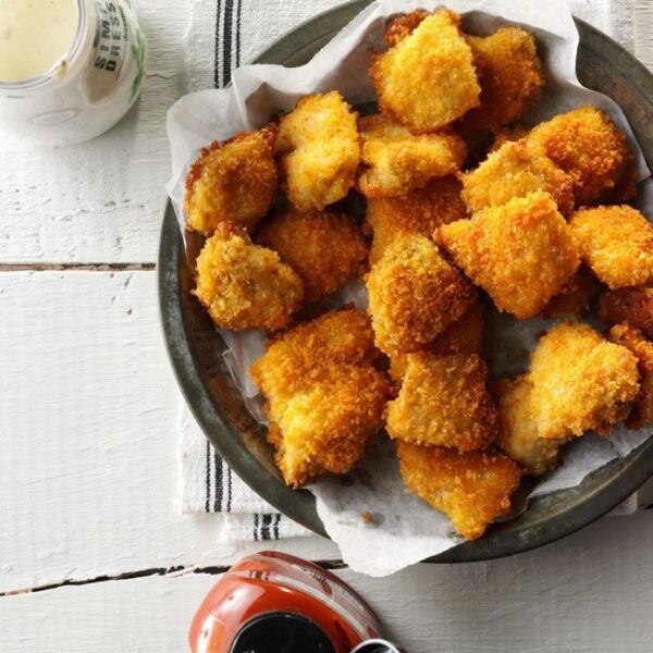 Тем временем, пока первая партия обжаривается, вы можете в отдельную тарелочку наделать и обвалять в панировочных сухарях другую. Чтобы потом в один миг все наггетсы опустить в масло.