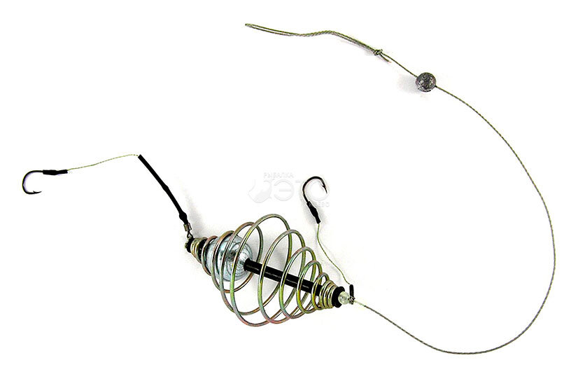 Затем начинаем накручивать свободный конец проволоки на корпус. Полученные завитки нужно растянуть так, чтоб кончик можно было закрепить во втором ушке. Кормушка готова. К каждому ушку необходимо привязать поводок с крючком. Вот и готова наша оснастка.