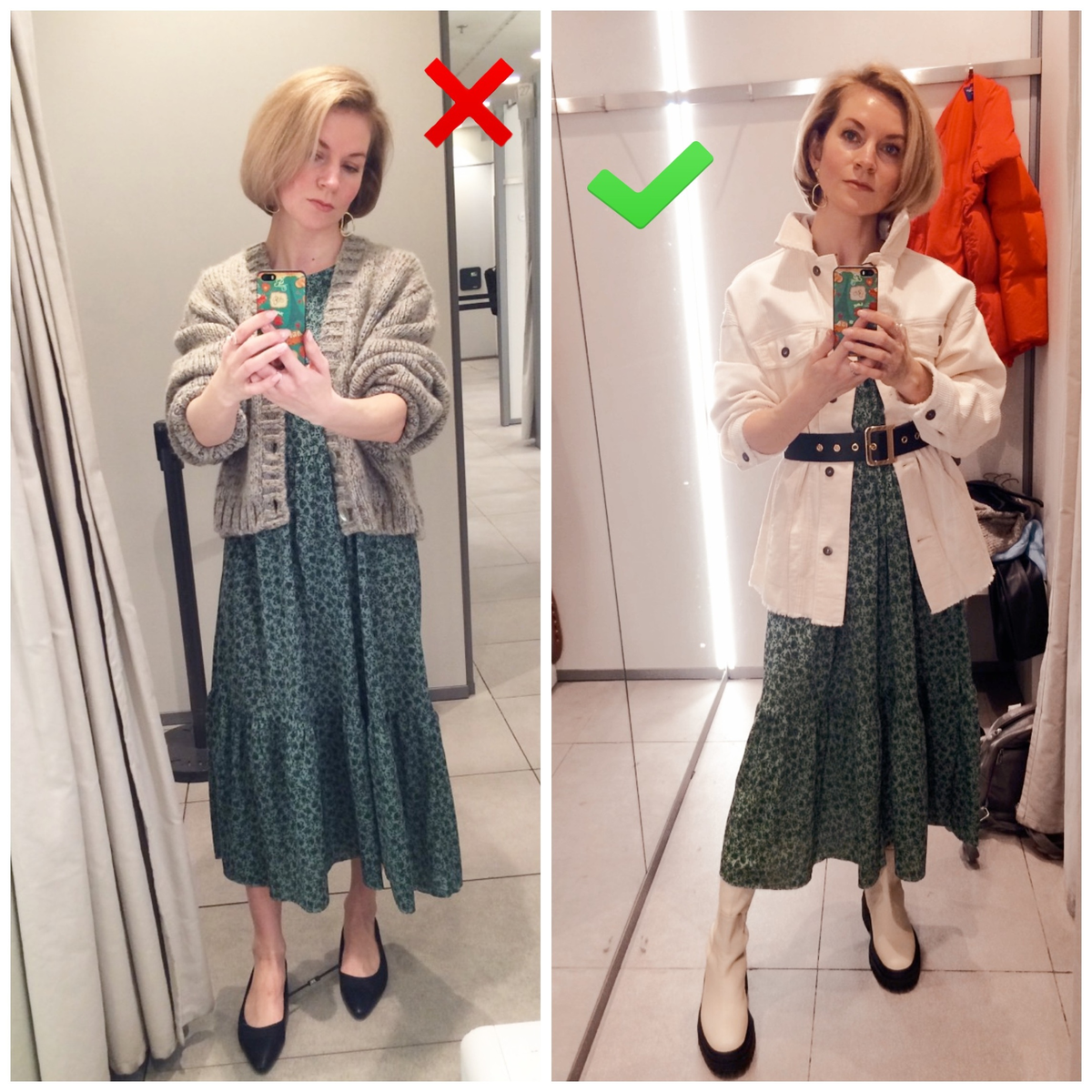 Начнем с обуви. Заменим безликие балетки на брутальные ботинки, пусть они будут даже немного странными и смешными. Такая обувь придаст образу нужную динамику. Снимем ужасный кардиган и наденем куртку в спортивном стиле. И добьем приторные цветочки широким ремнем. Фух, можно теперь и в люди выйти :)