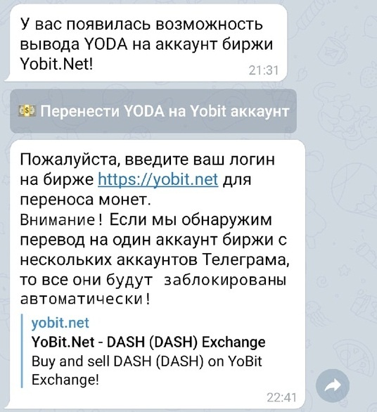 Для переноса монет Yoda на баланс биржи Yobit.net, пож-та зарегистрируйтесь - yobit.net и ожидайте сообщение от бота @fastexrobot (1-24 hrs)! YODA будут зачислены вам в InvestBox: yobit.net/ru/investbox/ Если вы уже зарегистрированы, то просто ожидайте сообщение и смотрите эти видео: О бирже Yobit.Net https://youtu.be/guenDHuxjS8 Как зарабатывать $$$ с YoBit InvestBox https://youtu.be/3IZrkARdLpA Как зарабатывать $$$ на форуме CryptoTalk https://youtu.be/ubXZJABwnoM Торговля Yoda будет открыта 4 февраля! В боте появится данное сообщение: В ответном сообщение нужно отправить боту ЛОГИН! под которым вы зарегистрированы на бирже (не почта!) иначе может выйти казус и вы не сможете получить свои YODA Для получения процента нужно будет каждый день делать пост в соцсети: выбираем понравившуюся соцсеть, нажимаем на ее иконку публикуем пост, возвращаемся в форму и вставляем ссылку на ВАШ ПОСТ, а не ваш аккаунт. Так же информация к размышлению от админов: