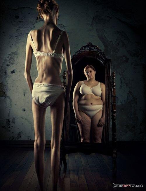 Основной характеристикой анорексии является неудовлетворенность изображением тела. Действительно, человек с нервной анорексией представляет собой своего рода когнитивное искажение, так как оно неправильно интерпретирует зеркальное отражение и воспринимает его совсем иначе, чем реально отраженное. Советы других, такие как «у вас все хорошо, вам не нужна диета» или «вы слишком слабы», могут звучать иррационально или безразлично и не могут убедить человека в реальности. Кроме того, индивид имеет дело не только со своим весом, но и «весит» глазом и другими и проводит сравнения.