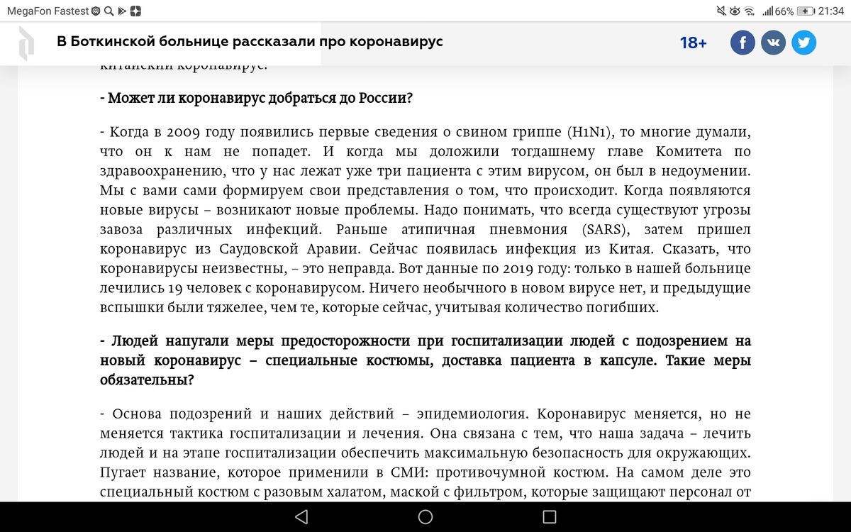 А вдруг вирус в России? Сегодня весь мир ошарашен страшной болезнью в Китае, и каждая страна принимает меру предосторожности. Россие надо бояться больше всех-из-за "заболевшего соседа" может заразиться и она. ЕСТЬ ЛИ ОН В РОССИИ? Правительство говорит, что в России вируса нет. Но так ли это на самом деле? Скорее всего государство умалчивает для избежания паники в стране, как намекает главврач Боткинской больницы. Вот что он говорит в своём интервью для spdnevnik.ru : ПОЛКИ С КОНСЕРВАМИ ПУСТЫ. Когда я ходила в Дикси, то заметила, что на полках консервы, пшеницу разобрались-оставалось 2-3 баночки. На многих сайтах я не могла найти маски- их раскупили! Остаётся сделать вывод, что люди готовятся к коронавирусу. Некоторые мои знакомые купили консервы на месяц, чтобы не выходить из дома если что. КАК ЗАЩИТИТЬ СЕБЯ ОТ ЭТОЙ "ЧУМЫ" 1)Я умоляю Вас, перед выходом надевайте маску! С каждым днем вы рискуете заразиться все больше! 2) промывайте нос морской водой. 3) купите долгосрочные про