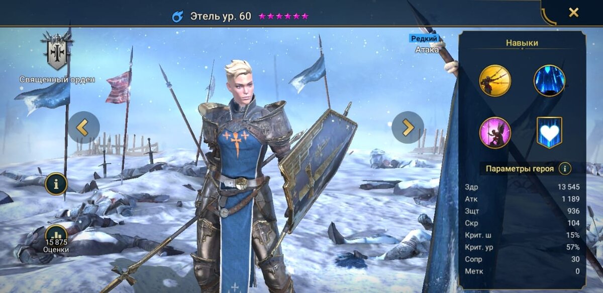 Здравствуйте пишу гайды по персонажам Reid, буду рад комментариям и подписке. В прошлый раз рассмотрели лучшего стартового героя Каэль. Брать однозначно стоит именно его, но рассмотрим и трех оставшихся, также в порядке силы. 2)Этель До нерфа была главным соперникам Каэля сейчас же просто хороший персонаж, заходящий на арену и Лавового рыцаря. Имеет три навыка каждый из которых полезен. 1.Удар наповал Герой атакует врага 3 раза. На последнем ударе с вероятностью 75% накладывает Слабость 25% на 2 хода. Прекрасный навык на Лавового рыцаря. При полной прокачке шанс наложить слабость 100% урон +20%. 2.Клинки богов Атака по всем врагам, шанс крит удара +15%. Отличный массовик для кача, паучков и арены + как бонус возможность не качать крит шанс на 100%, но в отличии от каэля нет заполнения шкалы скорость при том же множителе атаки.. При полной прокачке +20% к урону критично для арены. 3.Озарение Накладывает на себя Бонус атаки 25% на 2 хода. Если у героя меньше 50% здоровья, накладыв