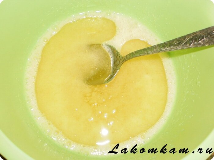 Приготовление индийского пирога с морковью. Яйца взбиваем с сахаром до белой пены, затем вливаем масло.