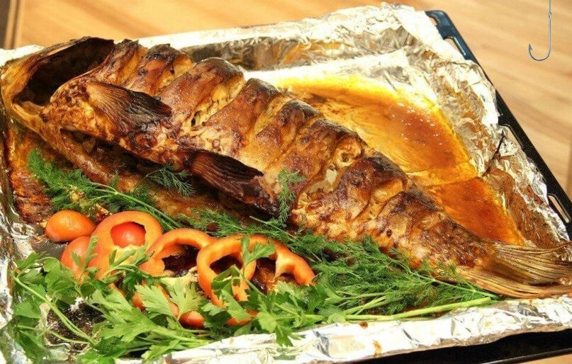 Рецепт 1: Рыба запеченная в фольге в духовке Фольга – отличное изобретение человечества – защищает пищевое сырье, как посуда, но не имеет отрицательных сторон. Фольга не окисляется, она компактна, легка, сохраняет полезные вещества в продукте, обеспечивает непревзойденный аромат рыбному блюду без всякого дополнительного вмешательства. Для данного рецепта целесообразно будет использовать мясо горбуши. Ингредиенты: горбуша - 1 шт.лимон - 1 шт.крупная головка репчатого лука, морковь – 1 шт., 50 гр. слив. масла, любая на выбор зелень для украшения. Способ приготовления: 1. Рыбу очистить, промыть. Лук порезать полукольцами. Морковь очищенную натереть на терке (желательно на крупной). Лимон, как и лук, нарезать полукольцевидными дольками. 2. Далее лук и морковь, посолив, поперчив, необходимо пережарить на растительном масле. Сначала жарится лук, затем добавляется морковь. 3. Рыбу также следует обмазать солью и перцем снаружи и изнутри, начинить ее обжаренными овощами, вложить 2-3 дольки ли