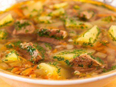 Ингредиенты: Как приготовить: 1) Мясо нарезать небольшими кусочками. Залить водой и варить в течение 1–1.5 часов. 2) Лук мелко нарезать. 3) Морковь натереть на крупной терке. 4) Картофель нарезать кубиками или брусочками. 5) На растительном масле обжарить лук и морковь. 6) В бульон добавить картофель. Посолить. 7) После того, как бульон закипит, добавить гречку. Варить в течение 10 минут. 8) Добавить лук и морковь. Варить до готовности. 9) Добавить лавровый лист, перец. Добавить выдавленный через чеснокодавку чеснок. Дать супу настояться под крышкой в течение 15–20 минут. Приятного аппетита!