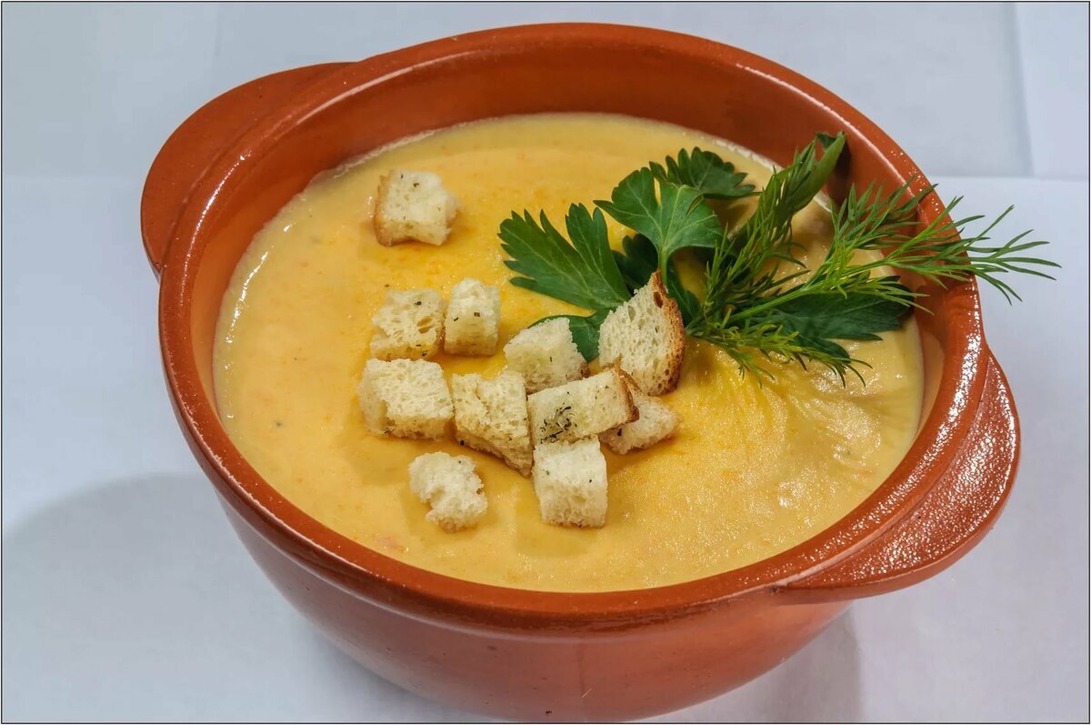 Нежный крем-суп на курином бульоне с плавленым сыром, понравится взрослым и детям. Нам понадобятся следующие ингредиенты: Курица(грудка или окорочок) 400г. Сыр плавленый 100г. Сливки 10% 100мл. Картофель 2шт. Морковь 1шт. Лук репчатый 1 шт. Чеснок 1 зубчик. Сельдерей 1 стебель. Растительное масло 2ст.ложки. Сливочное масло 30г. Белый хлеб 4 ломтика. Свежая зелень (по желанию) для подачи. Вода 1,5л. Приготовление: 1)Курицу в кастрюле залейте 1,5л. Воды. Доведите до кипения , снимите пену и варите бульон на небольшом огне 30 мин. 2)Достаньте курицу из бульона, чтобы немного остыла.Нарежьте куриное мясо небольшими кусочками, отставьте для подачи супа. 3)Очистите картофель, лук, морковь и чеснок. Стебель сельдерея и очищенные овощи произвольно нарежьте. 4)В кастрюле с толстым дном разогрейте растительное масло, добавьте овощи и обжаривайте на небольшом огне 7-10 минут. 5)Пока обжариваются овощи, сделайте гренки. В сковороде растопите сливочное масло. 6)Ломтики хлеба нарежьте куб