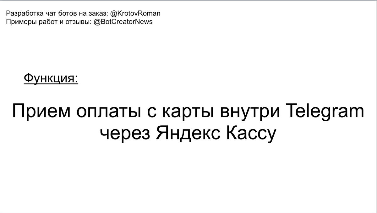 Сегодня мы разберем пример реализации функции приема оплаты с пластиковых карт внутри Telegram через Яндекс. Кассу. Стоит отметить, что для такой интеграции потребуется юридическое лицо и договор с сервисом Яндекс. Касса. Яндекс. Касса — сервис онлайн-платежей для индивидуальных предпринимателей, юридических лиц. Яндекс.Касса нужна, чтобы принимать оплату, отправлять деньги клиентам и решать другие задачи, связанные с электронными платежами. Подключается к сайту, блогу или онлайн-сервису (например, к соцсети или мессенджеру). Вот как выглядит интегрированная оплата через Яндекс. Кассу внутри бота Telegram: Просто нажимаем кнопку "оплатить", появляется всплывающее сообщение без перехода на какие-то сайты, встроенное прямо в самом Telegram. Далее вводятся данные карты, Яндекс.Касса подгружает вашу карту и происходит оплата. Таким образом, процесс заказов будет происходить обычным образом, а оплата осуществляться в самом мессенджере, без перехода на сторонний сервис. Эта функция отличн