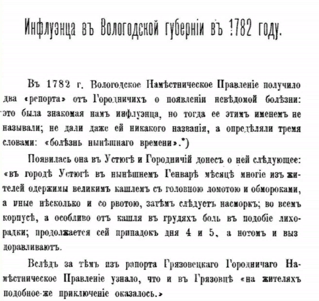 В литературно-научном (вот это жанр!) сборнике "Вологжанин" конца 19 века есть историческая заметка об инфлюэнце в губернии в 1782 г. Эпидемия шла, народ волновался, арбидолов для успокоения придумано не было, а потому лекарь Иордон написал для всех комендантов и городничих "Наставление" с прекрасным рецептом: