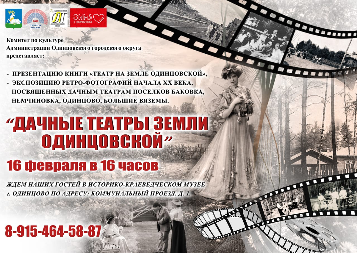 📢Комитет по Культуре Администрации Одинцовского городского округа представляет! ☝️ 16 февраля 2020 г. в 16.00 в залах Одинцовского историко-краеведческого музея состоится презентация четвертого издания «Театр на земле Одинцовской» (автор Лапшина С. А. , верстка Буймова Д. П., редактор Богданова М. ), посвященного дачным театрам. 🎭 🗣 Дачные театры Подмосковных поселков, возникающих на рубеже 19-20 вв. с развитием строительства железной дороги, составляют особую культуру дворянской жизни и досуга. В летних театрах давались любительские спекаткли, устраивались концерты и литературные вечера, гастролировали известные московские труппы. Содержателями и устроителями дачных театров часто становились сами дачники, благодаря их энтузиазму театр становился средоточием культурной жизни поселка. 🎩 По Московско-Брестской железной дороге такие театрики на рубеже 19-20 веков появились в каждом поселке – Немчиновке, Баковке, Одинцово, Больших Вяземах, что свидетельствует о высокой культуре отды