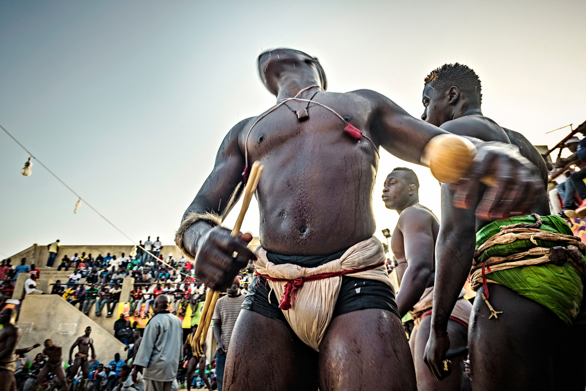 Когда наступает вечер на переполненном стадионе, тепло все еще излучается из земли, я становлюсь свидетелем того, как традиционная сенегальская борьба - с ее мистическими ритуалами «гри-гри», интенсивными барабанами и транс-подобным танцем - превратилась в высокий профиль, суперзвезда спорт. Борьба - la lutte по-французски или ягненок по-родному волоф - безусловно, самый популярный вид спорта в Сенегале, даже более любимый, чем футбол. Все население, от малышей до бабушек, следит за крупными поединками на стадионе, по телевизору или на улице. Сенегальская борьба отличается от той, что практикуется чаще в западных и азиатских странах - в основном из-за традиционных ритуалов, практикуемых конкурентами. В западных странах эти мистические ритуалы часто в разговорной речи называют вуду, но сенегальцы называют это гри-гри . Эти необычные ритуалы обычно выполняются с представлением и почитанием традиционных амулетов, использованием волшебных зелий, гипнотическим барабаном, песнями и танцами