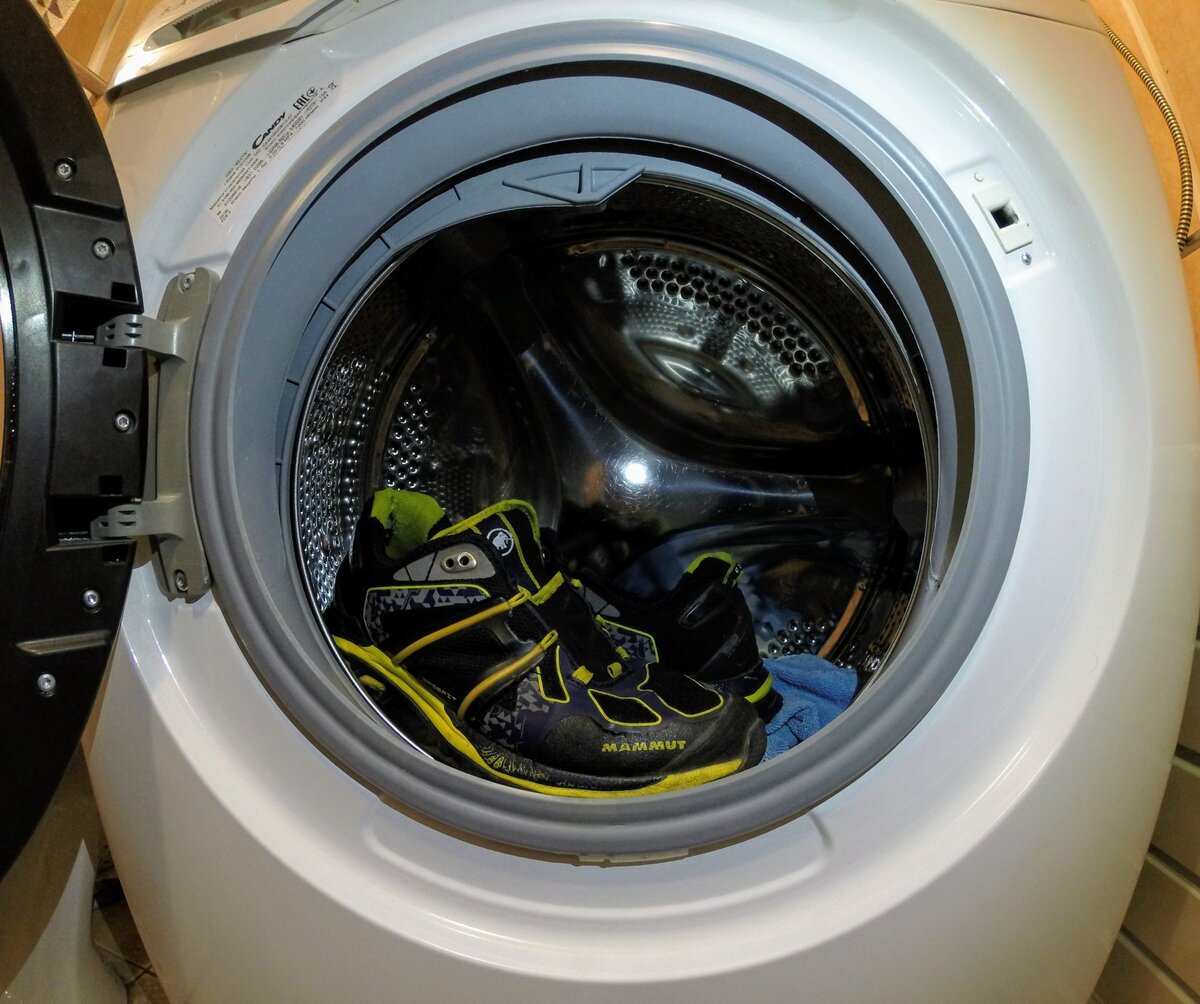3. Кладём в барабан стиральной машин тряпки, старые полотенца для лучшей балансировки и качества стирки, также чтобы не повредить барабан, подъёмники белья и смягчить удары, поверх этого ставим кроссовки (если есть мешочек для стирки, то лучше его использовать, особенно для шнурков), стельки я тоже стираю, но не рекомендуется это делать, из-за возможной деформации;