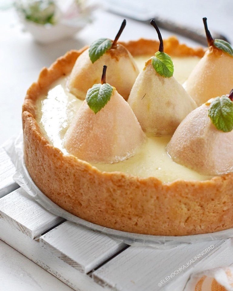 Ингредиенты: Для песочной основы (на форму 20–22 см): Сливочное масло — 150 г Сахар — 2 ст. л. Яйцо — 1 шт. Мука — 300 г Разрыхлитель — 1 ч. л. Соль — щепотка Ванильный сахар — пакетик Для груш: Груша (чистим от кожуры, подрезаем донышко, чтобы груша уверенно стояла) — 5–7 шт. Цедра лимона — 1 шт. Вода — 800 мл Сахар — 180 г Желатин — 7 г Для крема: Грушевый сироп — 130 мл Сливки 33% — 80 мл Яйцо — 2 шт. Сахар — 3 ст. л. Мука — 2 ст. л. Приготовление: 1. Для основы смешать все сухие ингредиенты, добавить масло (из холодильника) и растереть в крошку. 2. Добавить яйцо, скатать тесто в шар и отправить в холодильник на 30 минут. 3. Охлаждённое тесто достать из холодильника, раскатать и уложить в форму, наколоть вилкой дно и бортики. 4. Форму охлаждать в морозилке 30 минут и отправить в духовку при 200 °С на 15 минут (бока торта должны подрумяниться). 5. Пока основа выпекается, приготовить груши: очистить их от кожуры, подрезать дно, чтобы груша уверенно стояла. 6. Соединить сахар и