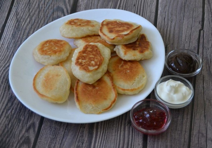 Ингредиенты: Вода — 125 мл Молоко — 125 мл Соль — 0,75 ч. л. Сахар — 2 ч. л. Пшеничная закваска — 50 г Мука — 200 г Масло растительное — 50 мл Приготовление: 1. Влейте в емкость для замешивания теста молоко и воду, добавьте соль, сахар, положите закваску. Хорошо размешайте, оставьте примерно на 1 час в тепле, чтобы закваска активировалась. 2. Всыпьте просеянную муку и замесите тесто. Накройте пищевой пленкой и оставьте на 5–6 часов. Лучше это делать с вечера и оставить на ночь. 3. Утром тесто выглядит пышным, с пузырьками, из такого уже можно выпекать оладьи. 4. Разогрейте сковороду, влейте растительное масло, жарьте оладьи с двух сторон до готовности. 5. Подавайте оладьи со сметаной, вареньем или джемом.