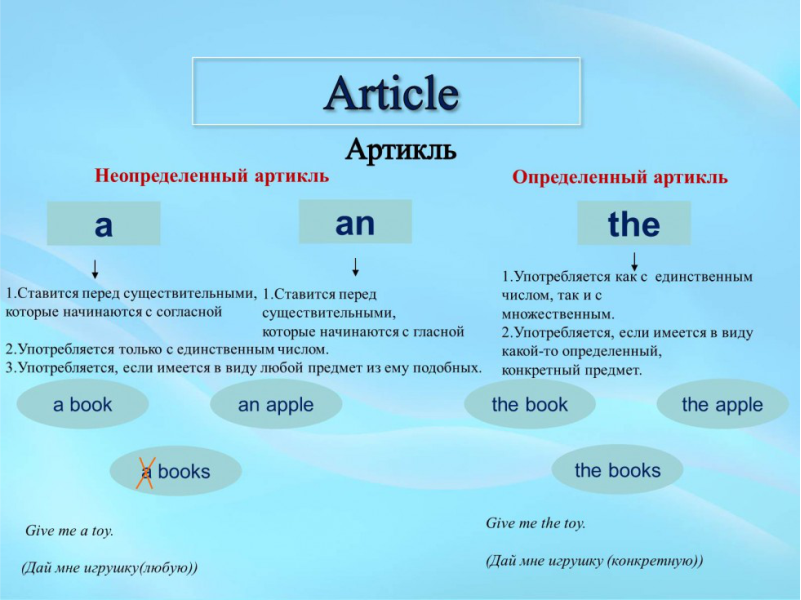 Определенный артикль «the» Определенный артикль употребляется в следующих случаях: Примечание: Создать карусель Добавьте описание определенный артикль the также может употребляться с неисчисляемыми существительными, если речь идет об определенном количестве вещества: Определенный артикль с географическими названиями Определенный артикль необходимо употреблять со следующими географическими названиями: C названиями стран, озер, гор (пиков), островов, городов, континентов, улиц, площадей, аэропортов артикль не используется. Исключения : Определенный артикль употребляется также с названиями гостиниц, кинотеатров, театров, газет и журналов.