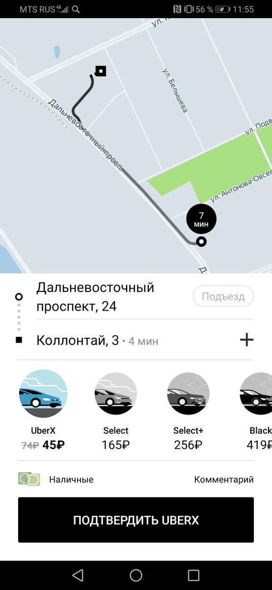 Я думаю многие знают о том что в Яндекс такси при заказе тарифов Комфорт и выше можно использовать скидку 10 процентов, которую Яндекс великодушно раздаёт всем подписчикам их сервиса Яндекс плюс. И скидка это почему-то идёт за счёт водителя, но да ладно, тема эта много раз обсуждалась, логики в ней мало, но скидка всё-равно есть. А за чей счёт идёт скидка на экономе? Она мифическим образом появляется у некоторых пользователей. Сама техподдержка уверяет что алгоритм сам её раздаёт, но это неправда. У меня она начала появляться после неккоректного расчёта одного из предыдущих заказов, когда я упорно добивался пересчёта суммы. В данный момент в Яндексе она у меня пропала, но появилась в приложении Uber Цена смешная - дешевле автобуса, почему бы не воспользоваться?) но надо понимать, что водитель, если он поедет, потратит 7 минут минимум чтобы доехать (если верить приложению), потом дождаться пассажира и только потом ехать. Неужели водитель получит 45 рублей? Заказывать я буду сам себ