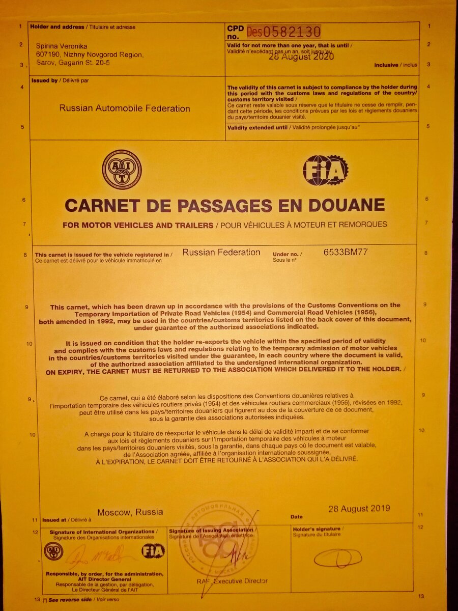 Если вы хотите путешествовать в другие страны на своём ТС, то вам необходимо оформить такой документ, как Карнет де Пассаж. Это международный таможенный документ, и с ним вы можете спокойно путешествовать по странам без уплаты каких-либо таможенных платежей и без необходимости на каждой границе оформлять кучу документов. Список стран, в которых требуется карнет: Аргентина, Бразилия, Канада, Чили, Колумбия, Коста-Рика, Антильские острова, Эквадор, Ямайка, Мексика, Парагвай, Перу, Суринам, Тринидад и Тобаго, Уругвай и Венесуэла, Бахрейн, Бангладеш, Индия, Индонезия, Малайзия, Мьянма, Непал, Оман, Шри-Ланка, Сирия, Объединенные Арабские Эмираты и Йемен, Япония, Иордания, Катар, Сингапур, Бенин, Ботсвана, Буркина-Фасо, Камерун, Центральноафриканская Республика Чад, Коморские Острова, Кот-д’Ивуар, Конго, Египет, Габон, Пакистан, Гана, Гвинея-Бисау, Кения, Лесото, Ливия, Мадагаскар, Малави, Мали, Мавритания, Намибия, Нигер, Сенегал, Сомали, Южная Африка, Свазиленд, Танзания, Того, Уга