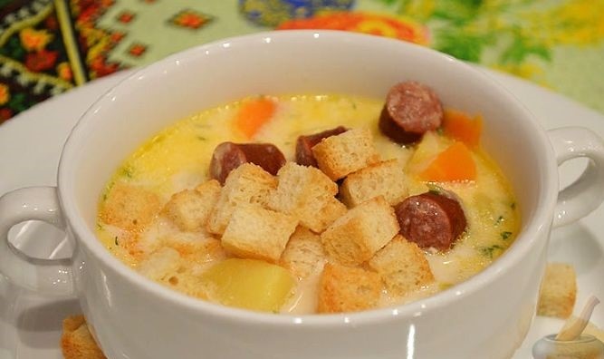 Это очень сытный, вкусный сырный суп со вкусом копченостей. Вы только представьте, какой аромат наполнит вашу квартиру при приготовлении этого блюда. Ну что преступим к готовке, для этого нам понадобится: 1. Плавленый сырок - 2 шт. (150-200г.) 2. Копченые колбаски (150г) 3. Картофель - 3 шт. 4. Морковь - 1 шт. 5. Лук репчатый - 2 шт. 6. Чеснок - 3 зубчика 7. Растительное масло (для жарки) 8. Зелень (по вкусу) 9. Соль и перец (по вкусу) 10. Кириешки со вкусом бекона (для подачи) Ну что, приступим, приготавливаем все продукты. Чистим и промываем овощи. Разогреваем казанок с маслом и добавляем чеснок, если вы любите остроту, то давим ножом чеснок, измельчаем, первым его добавляем в казанок и в дальнейшем не вынимаем. Если же вам не нравятся острые блюда, то режем пластами чеснок, жарим в казанке до золотистой корочки и вынимаем. После чеснока добавляем овощи, а именно лук и морковь, жарить до прозрачности. Добавляем колбаски (нарезанные кружками , либо так, как любите) Нарезаем картофел
