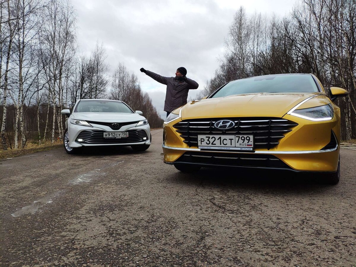 С новым поколением Hyundai Sonata мы успели познакомится ещё давно. Причём, подобно современным отношениям, сначала мы видели только её фото, потом она засветилась на видео, а кульминацией стало то, когда мы пришли на встречу "в живую"... Но сегодня, мы пригласили на встречу не только её. Но и признанную вами, модель, которая является абсолютным лидером в своём классе! Конечно же, мы про Тойоту Камри. А пока, ознакомьтесь с характеристиками: — Hyundai Sonata Двигатель: 2.5 R4 MPI Мощность: 180 л.с. при 6000 об/мин Крутящий момент: 232 Нм при 4000 об/мин Трансмиссия: Автомат 6 ступ. Макс. скорость: 210 км/ч Разгон до сотни: 9.2 сек Привод: Передний Масса снаряжённая/полная: 1484/1980 кг — Toyota Camry Двигатель: 2.5 R4 Мощность: 181 л.с. при 6000 об/мин Крутящий момент: 231 нм при 4100 об/мин Трансмиссия: Автомат 6 ступ. Макс. скорость: 210 км/ч Разгон до сотни: 9.9 сек Привод: Передний Масса снаряжённая/полная: 1555–1625/2030 кг Что таить, тогда эта красотка точно запала нам в голов