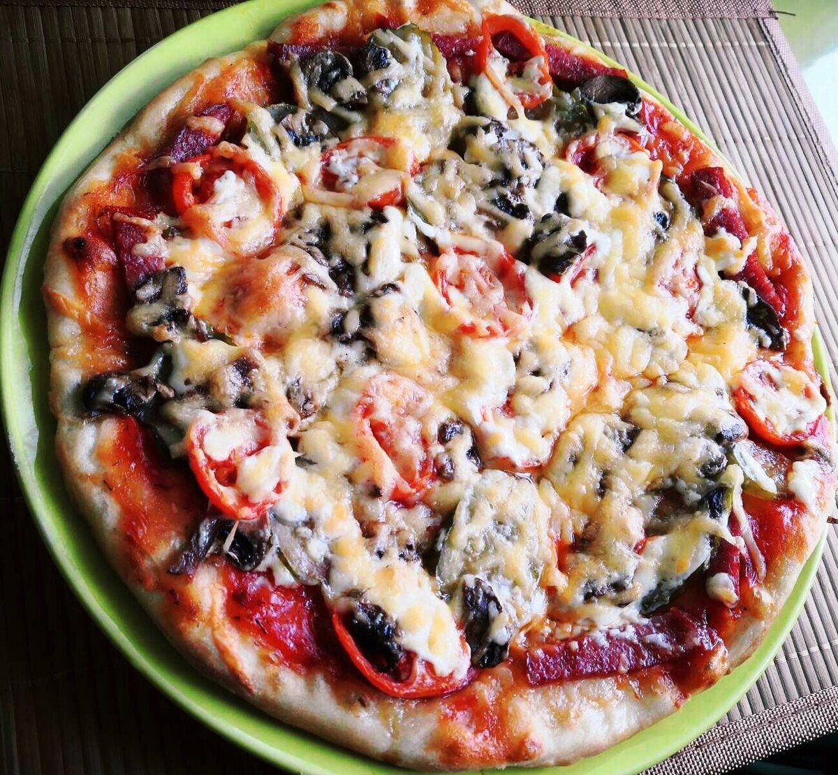 Нам понадобятся : Начинка: Томатный соус 200 гр, Ветчина 200 гр, Маслины по вкусу, Помидоры 3 шт, Сыр 200 гр. Приготовление: Развести дрожжи в теплой воде.Добавить соль,сахар,масло.Все перемешиваем венчиком.Всыпать часть просеянной муки(где то 2/3 от всего количества ) и замешиваем тесто.Остальную муку высыпаем на стол и вымешиваем ,смазав руки маслом. Тесто должно получиться эластичным и хорошо отходить от рук.Потяните его в разные стороны. Перекладываем готовое тесто в чашку,накрываем полотенцем и оставляем в теплом месте на 1-2 часа. Можно сделать две маленькие или одну большую пиццу. Раскатываем пиццу подушечками пальцев, без скалки.Если скалкой,то края не затрагиваем. Выкладываем начинку. Выпекаем при 180-200 гр. 15-20 мин , контролируйте время по своей духовке. Приятного аппетита!!! Ставьте лайки и подписывайтесь на мой канал !!!!