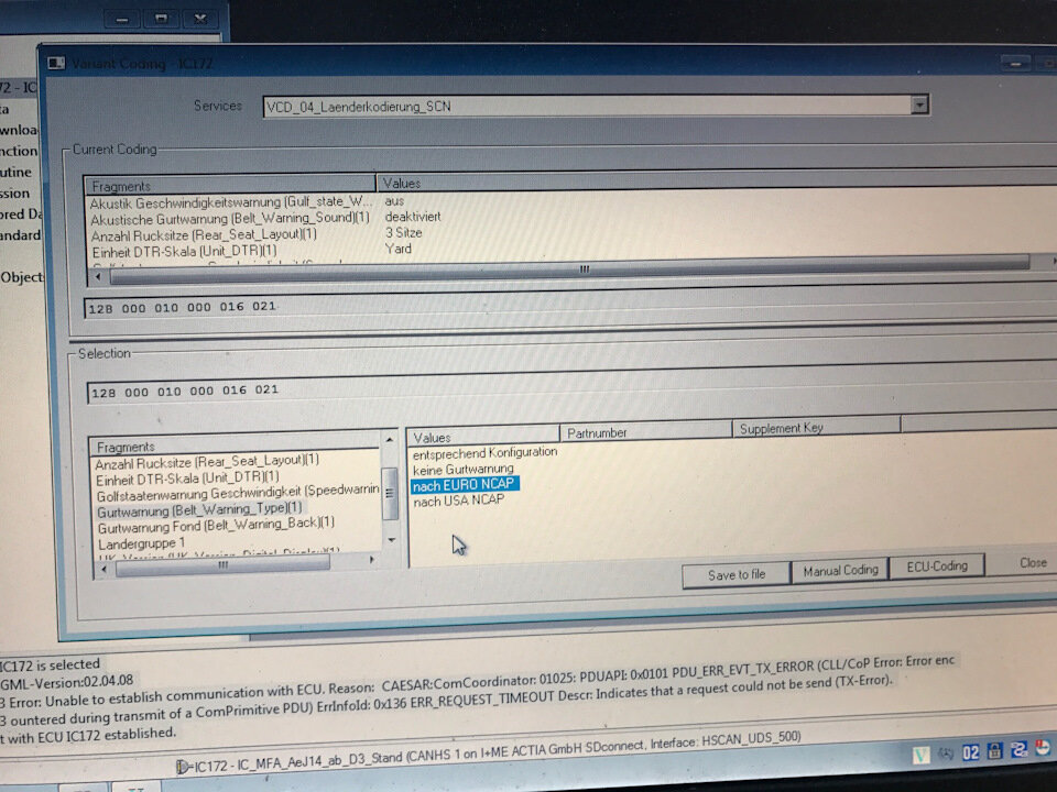 💎В общем находим раздел сервисов — VCD_04_Laenderkodierung_SCN и в нем среди фрагментов находим — Gurtwarnung (Belt_Warning_Type) — в заводских кодировках стоит — nach EURO NCAP (по ЕВРО стандарту), для американцев предполагаю стоит кодировка по Американскому стандарту, а нам надо закодировать — keine Gurtwarnung — ну и все… после этого нет назойливого сигнала о не пристегнутых ремнях и нет светящегося беременного мужика :)