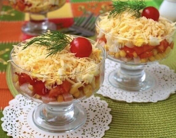 🔹Ингредиенты: Курица копчёная - 200 грамм; Яйца варёные - 2 шт; Кукуруза консервированная - 0.5 банки; Сыр твёрдый - 120 грамм; Помидоры - 3 шт; Чеснок - 1 зубчик; Майонез - по вкусу. 🔹Описание процесса приготовления: Салат "Восторг" - это вкусный и сочный салат с копчёной курицей и помидорами. За счёт курицы салат получается очень сытным, а помидоры придают ему сочность. Такой салат лучше готовить порционно для каждого гостя. Салат яркий и замечательно подойдёт на любой праздничный стол. Чтобы приготовить салат "Восторг" нам понадобится копчёная курица(можно взять филе или окорочёк), свежие помидоры, твёрдый сыр, зубчик чеснока, яйца, кукуруза и майонез. Копчёную курицу нарезать небольшими кубиками. Также кубиками нарезать помидоры. Выложить кубики курицы в порционные креманки, сделать майонезную сеточку и немного посыпать измельчённым чесноком. Сверху выложить 2-3 столовых ложки кукурузы. На кукурузу нанести тонко майонезную сетку и выложить помидоры. Яйца нарезать куб