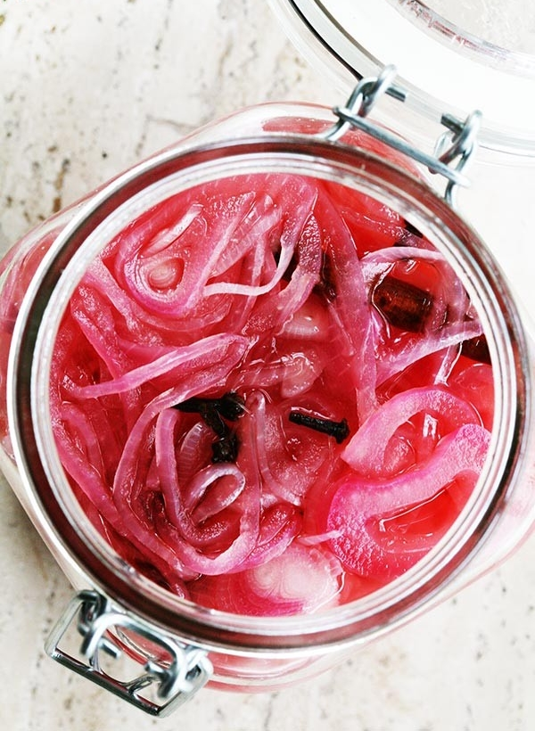 Пикантная закуска, которая придаст яркости и оригинальности салатам, блюдам из мяса и рыбы, это идеальный компонент для хот догов и гамбургеров! Все, что вам действительно нужно для приготовления маринованного красного лука, это нарезанный красный лук, уксус и сахар! Возможны также дополнения пряностями и зеленью. В своем рецепте я использую корицу, гвоздику, анис, лавровый лист и хлопья красного перца. Вы можете легко добавить немного имбиря, поменять хлопья чили на тмин или гвоздику на душистый перец. Ингредиенты: СПЕЦИИ корица: 1/2 палочки гвоздика: 5 шт. лавровый лист: 1 шт. звездчатый анис: 1 шт. хлопья красного перца Способ приготовления: 1. Бланшируйте красный лук в кастрюле с кипящей водой в течение 2 минут. Слейте в дуршлаг. 2. Пока вода нагревается на шаге 1, в отдельной кастрюле смешайте уксус, сахар и специи. Доведите до кипения, уменьшите огонь, накройте крышкой и готовьте 5 минут. 3. Добавьте очищенный, высушенный лук к смеси уксуса. Варите на медленном огне 1 минуту