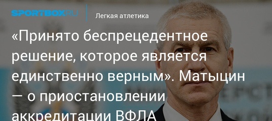 Министр спорта РФ Олег Матыцин прокомментировал решение о приостановлении государственной аккредитации Всероссийской федерации легкой атлетики (ВФЛА). — Данное решение было принято на основании того, что в последнее время нынешнее руководство ВФЛА не приняло достаточных мер по обеспечению интересов защиты спортсменов, по борьбе с допингом. Кроме того, руководство не выстроило конструктивного диалога с Международной федерацией легкой атлетики. Данное решение никоим образом не повлечет за собой риска ухудшения положения и участия индивидуальных атлетов в международных соревнованиях, не будет препятствовать планомерной организации календаря спортивных соревнований в России и, надеемся, будет способствовать выстраиванию диалога с международной федерацией. Мы понимаем весь кризис сложившейся ситуации и надеемся, что данные меры приведут к позитивному результату. Ранее мы с Олимпийским комитетом России сделали совместное заявление: будет создана рабочая группа по подготовке и проведению в