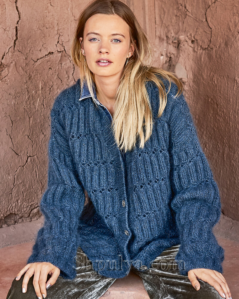 Размеры: 36/38 (42/44). Вам потребуется: пряжа (78% мохера, 14% шелка, 4% полиамида, 4% полиэстера; 210 м/25 г) — 300 (325) г темной иссиня-зеленой; спицы №5 и 5,5; круговые спицы №5; 5 серебристых пуговиц. Узоры для вязания кардигана спицами для женщин Внимание! Вязать только двойной нитью. Рельефный узор. Число петель кратно 6 + 3 + 2 кромочные = вязать согл. схеме. На ней даны лицевые и частично изнаночные ряды. В неприведенных изнаночных рядах петли провязывать по рисунку. Начать с 1 кромочной, раппорт постоянно повторять, закончить петлями после раппорта и 1 кромочной. Постоянно повторять 1—36-й ряды. Резинка. Число петель кратно 4 + 2 + 2 кромочные. Лицевые ряды: кромочная, попеременно 2 лицевые, 2 изнаночные, закончить 2 лицевыми, кромочная. Изнаночные ряды: петли провязывать по рисунку. Плотность вязания: 20 п. х 22 р. = 10 x 10 см. Описание вязания кардигана спицами для женщин Спинка. Двойной нитью на спицы №5 набрать 113 (125) петель и вязать рельефным узором. Через 4 ряда