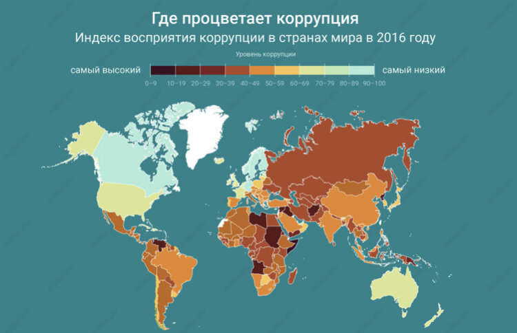 Самые коррумпированные страны мира: На каком месте Россия? Россия занимает 136 место и находится между Ливаном(137 место) и Ираном(135 место). Топ- 5 самых НЕкоррумпированных стран : Какое место занимают постсоветские страны(от худшей к лучшей): Как мы видим лучше всего дела с коррупцией обстоят в Прибалтике и Грузии. Спасибо за прочтение! Здесь вы можете узнать про зарплаты руководителей постсоветских стран!