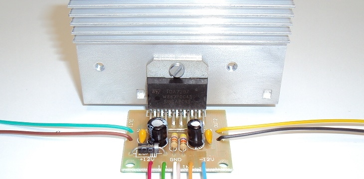 Популярная схема, высокое качество звучания, минимально количество элементов обвязки, коэффициент искажений 0,1%, диапазон воспроизводимых частот 20 - 20.000 Гц, коэффициент усиления 32 дБ, ток потребления до 2 ампер (источник питания не менее 3 ампер). Мостовая схема усиления, разделительные конденсаторы на динамики не применяются. Благодаря этому достаточно небольшого радиатора охлаждения 45 см кв. В этом наборе рассматривается стереофонический усилитель мощности на популярной микросхеме TDA7297. Основные характеристики усилителя: выходная мощность 2х15 ватт, диапазон питающего однополярного напряжения 6,5 – 18 вольт, рекомендуемое сопротивление динамиков 8 Ом, усиление 32 дБ, ток потребления 2 ампера, нелинейные искажения 0,1%, диапазон воспроизводимых частот 20 – 20.000 Гц. Устройство имеет минимальное количество элементов, довольно высокое качество воспроизведения. Доработка схемы будет заключаться только в добавлении на входе усилителя спаренного переменного рез