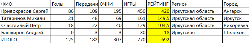 Рейтинг игрока=(1,0*ОЧКИ + 0,5*МАТЧИ)