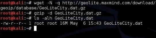 1. Запускаем Kali и открываем терминал Первым шагом, конечно, является запуск нашей надежной системы Kali или, в данном случае, любого дистрибутива Linux. Затем откройте терминал. Примечание: обратите внимание на форматирование ниже для команд. Форматирование этого элемента создаст большие пробелы, поскольку он растягивает линии, чтобы соответствовать краям. Это связано с тем, что длинные URL-адреса пытаются поместиться в отдельной строке. Большие пробелы равны одному пробелу, так что имейте это в виду. Обратитесь к скриншотам, чтобы увидеть, как они на самом деле выглядят. 2. Загрузить базу данных Теперь нам нужно загрузить базу данных из MaxMind, и мы можем получить ее, набрав следующее. kali > wget -N - q http://geolite.maxmind.com/download/geoip/database/GeoLiteCity.dat.gz Тогда нам нужно распаковать его. kali> gzip -d GeoLiteCity.dat.gz Давайте теперь проверим, что база данных на месте, перечислив каталог. kali > ls -alh GeoLiteCity.dat 3. Загрузить и установить Pygeoip Далее на