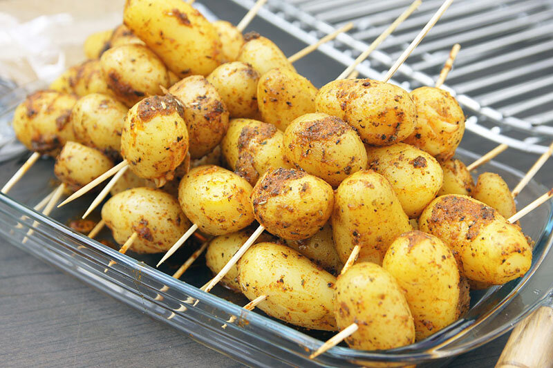 Картофель насаживаем на деревянные шпажки и отправляем запекаться в разогретой духовке при 180 градусах 35 - 45 минут. Подаём к столу