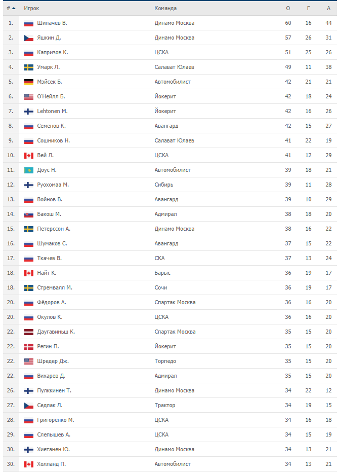 Регулярный чемпионат КХЛ вышел на финишную прямую. Уже известны 6 участников плэйофф, а за остальные места пока идёт борьба. Кто же возглавляет гонку бомбардиров? Давайте посмотрим. Пока что лидерами бомбардирской гонки являются динамовцы - Вадим Шипачёв и представляющий Чехию Дмитрий Яшкин. Следом за ними идут армеец Кирилл Капризов, по всей видимости проводящий последний сезон в КХЛ (хотя ближе к пенсии ещё наверняка вернётся), и лидер Салавата Линус Умарк. Остальные уже прилично отстают. Ещё интересная статистика. Из 30 лидеров лишь 12 представляют Россию, остальные 18 легионеры. Вообще в большинстве клубов на лидерских позициях легионеры, что наверно неудивительно, лучшие из российских игроков всё-таки пока ищут возможность уехать за океан. Посмотрим, кто же лучший снайпер, кто пока лидирует по числу забитых шайб. Тут лидер Дмитрий Яшкин, Капризов наступает ему на пятки. Стоит отметить, что Яшкин лишь первый сезон играет в КХЛ. До этого он несколько лет мучался в четвёртых звеньях