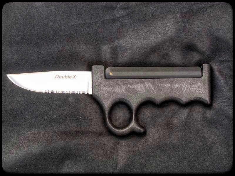 Принцип открытия ножа Double Х прост, замыкание клинка рычагом происходит с верхней, а не боковой стороны рукояти, клинок выходит из передней части ручки, для выхода необходимо рычаг поднять вверх и затем толкать к передней части ручки до конца. Данная конструкция обеспечивает надежную фиксацию клинка, и исключает его случайное складывание.